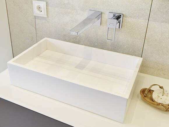 Neben dem gelungenen Lichtdesign setzen auch die topmodernen Designarmaturen Glanzpunkte. Die wandhängenden Metropol Armaturen mit ihren geometrischen Formen und Bügelgriffen wurden unter Putz verlegt. Sie passen perfekt zur kantigen Formensprache an Waschbecken, Badewanne und Dusche.
