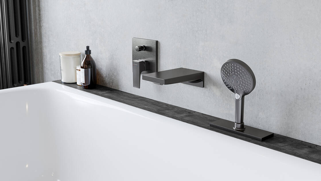 Setzen Sie an der Badewanne Designakzente: zum Beispiel mit dem freistehenden Mischer (auch als Wanneneinlauf erhältlich). Zu seiner hohen, eleganten Silhouette passt die Stabhandbrause. Am Wannenrand können Sie sich Metropol in 2-, 3- und 4-Loch-Varianten installieren lassen. Oder den Einhebel-Unterputzmischer in quadratischem Design.